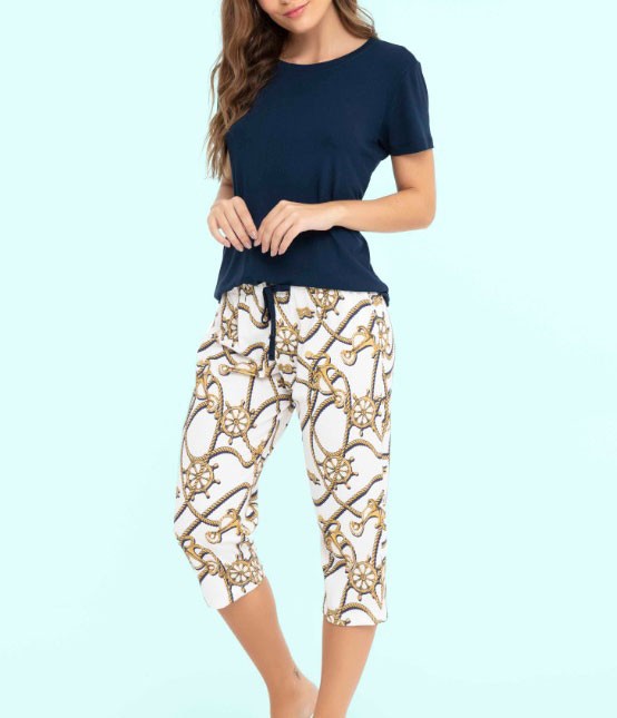 Pijama Capri Sensare (13162), coleção Náutico. Camiseta lisa confeccionada em viscolycra, com toque macio e suave. Gola arredondada e manga curta. Calça modelagem capri confeccionada em meia malha 100% algodão. Linda estampa náutica acrescenta charme à peça. Cós com elástico embutido para ajuste perfeito e toque zero na pele, possui detalhe de cordão. Barra em tecido duplo. Composição: Camiseta: 96% Viscolycra e 06% Elastano. Calça: 100% Algodão.