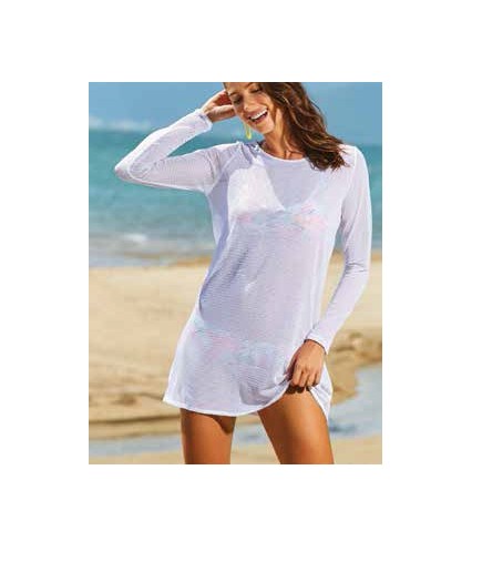 Vestido Manga Longa Água Doce (14258), coleção Lisos Raviera. Confeccionado em tecido telado de leve transparência, extremamente confortável. Vestido curto manga longa. Gola arredondada. Mangas e barra com acabamento em tecido duplo. Composição: 95% Poliamida e 5% Elastano.